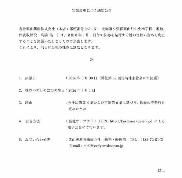 定款変更につき通知公告